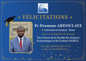 Le CREG adresse ses chaleureuses félicitations au Pr. Dramane ABDOULAYE pour sa nomination en tant que Vice-Doyen de la FASEG de l’Université de Parakou (Bénin). Nous lui souhaitons