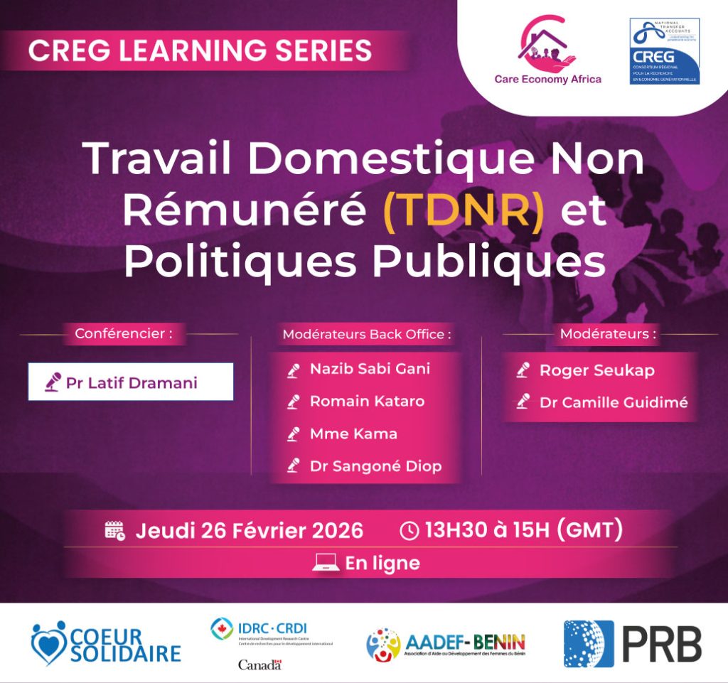 Thème : Leadership des femmes et compétition de temps Lundi 02 mars 2026 13h30 – 15h00 GMT Le Consortium régional pour la recherche en économie générationnelle (CREG) vous convie à son troisième webinaire du CREG Learning Series, consacré au leadership féminin et aux enjeux liés à la gestion du temps dans nos sociétés. Ce rendez-vous vise à […]