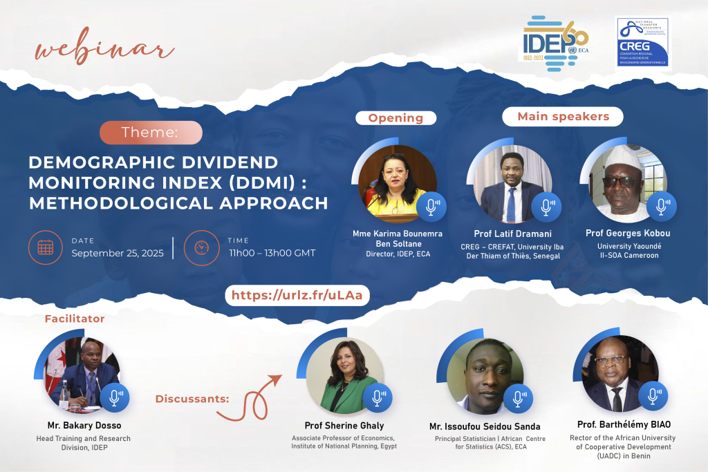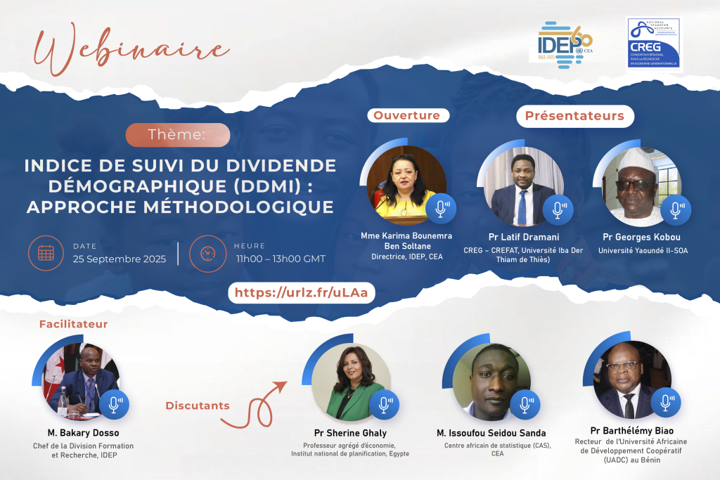 Theme:Demographic Dividend Monitoring Index (DDMI): Methodological Approach 👥 Who should attend?• Young Economists (CEA-RJE)• African Statisticians (YAS)• Researchers, students, policymakers 🎯 Why join?• Understand key concepts behind the Demographic Dividend (DD)• Explore the DDMI as a strategic tool for policy tracking• Engage with leading experts from Africa and beyond 🎙️ Speakers include:• Ms. Karima Bounemra Ben Soltane (IDEP)• […]