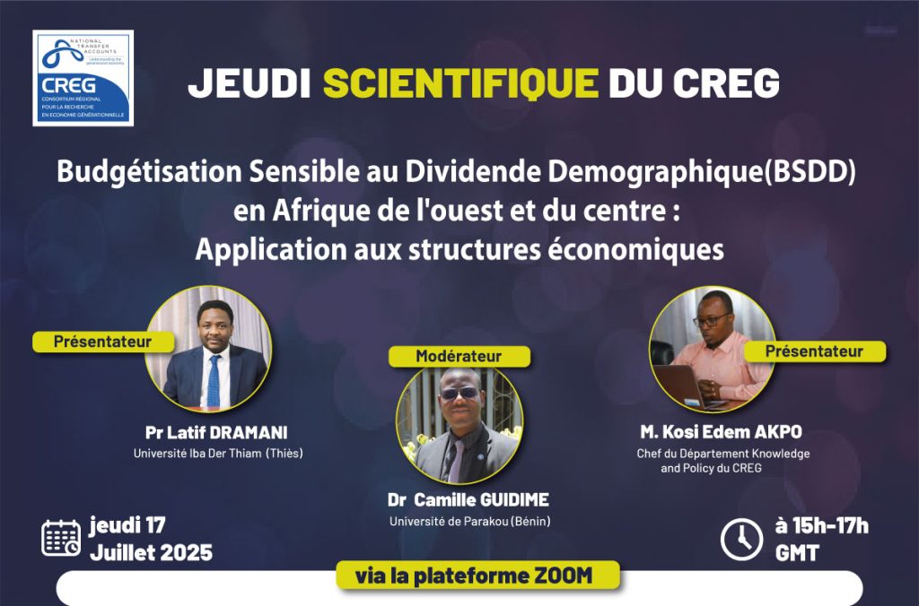 🗓 Date : Jeudi 17 juillet 2025 🕒 Heure : de 15h à 17h GMT 💻 Format : Session virtuelle 🎓 Thème : Budgétisation sensible au dividende démographique en Afrique de l’Ouest et du Centre : Application aux structures économiques Vous êtes chercheur, décideur public, partenaire technique ou simplement intéressé par des politiques publiques inclusives et fondées sur des données probantes ? Cette session […]