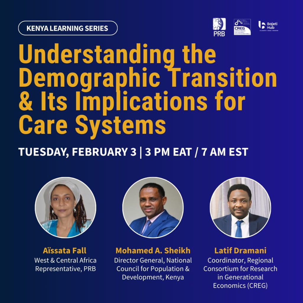 The Consortium Régional pour la Recherche Économie Générationnelle (CREG), in partnership with the Population Reference Bureau (PRB), is pleased to invite you to a series of six high-level webinars on: « Care and Demographic Dividend Sensitive Budgeting » 🗓 Dates : Every Tuesday, from February 3 to March 10, 2026⏰ Time : 12:00 – 13:30 GMT 🎯 ObjectivesThis webinar series will bring together senior policymakers, donors, […]