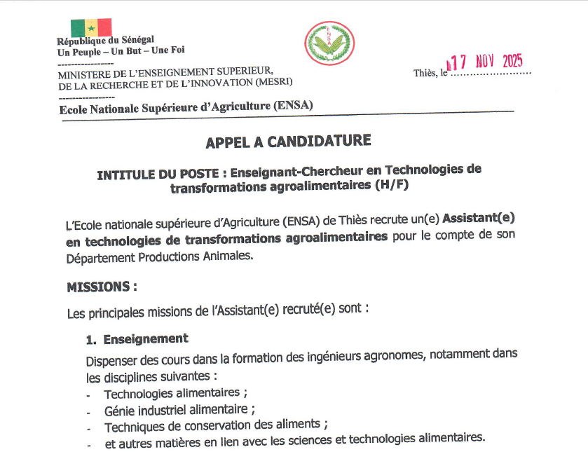 Dans le cadre du renforcement de ses équipes pédagogiques et scientifiques, l’École Nationale Supérieure d’Agriculture (ENSA) de Thiès lance deux appels à candidatures pour le recrutement d’enseignants-chercheurs. Ces postes s’inscrivent dans la mission de l’ENSA de former des ingénieurs agronomes de haut niveau et de promouvoir la recherche appliquée au service du développement agricole et agroalimentaire du […]